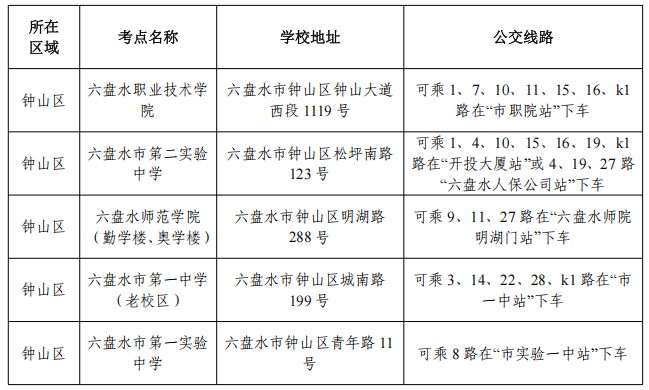 六盘水考区笔试共设18个考点,各考点名称、考点详细地址及到达公交线路如下: